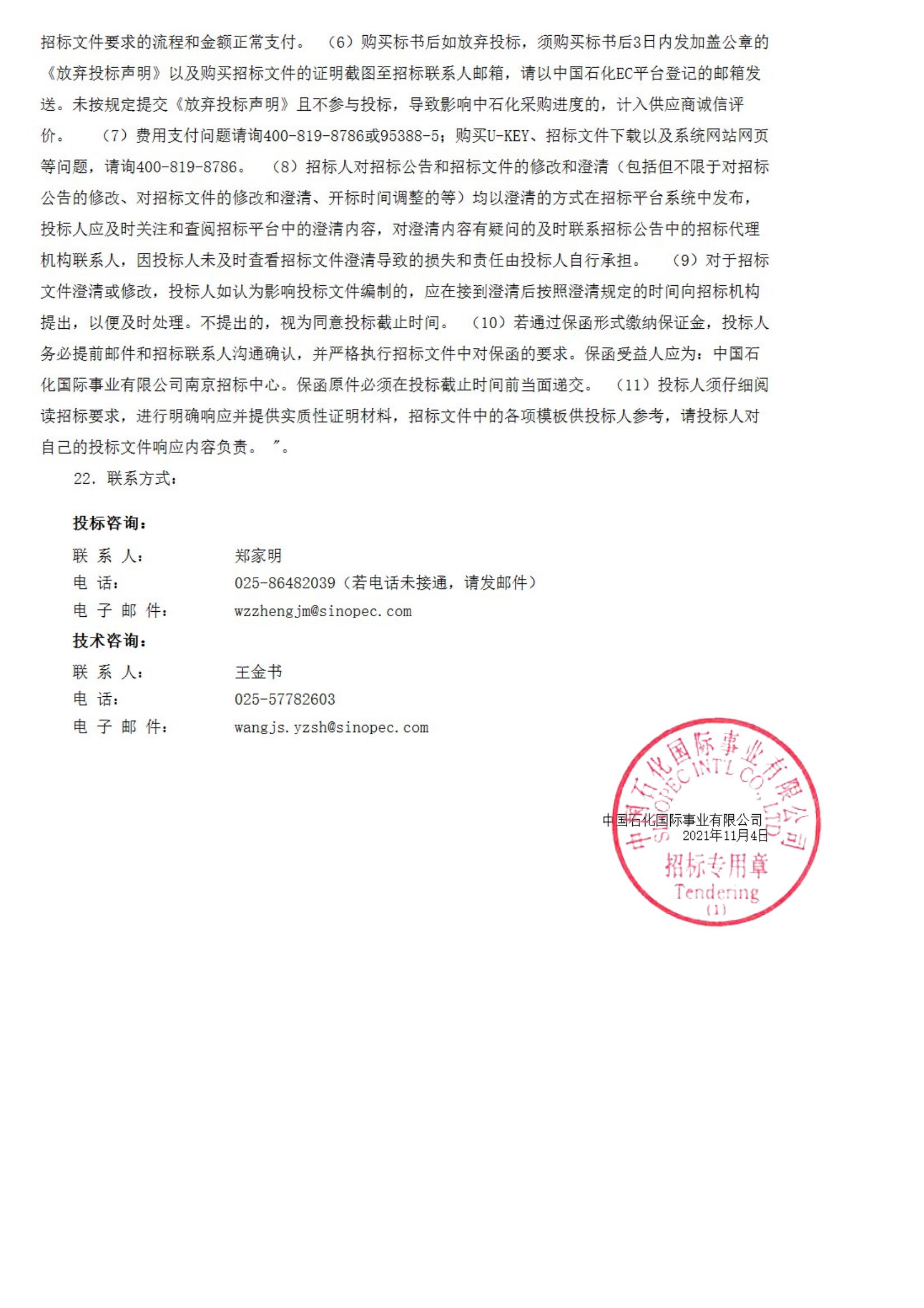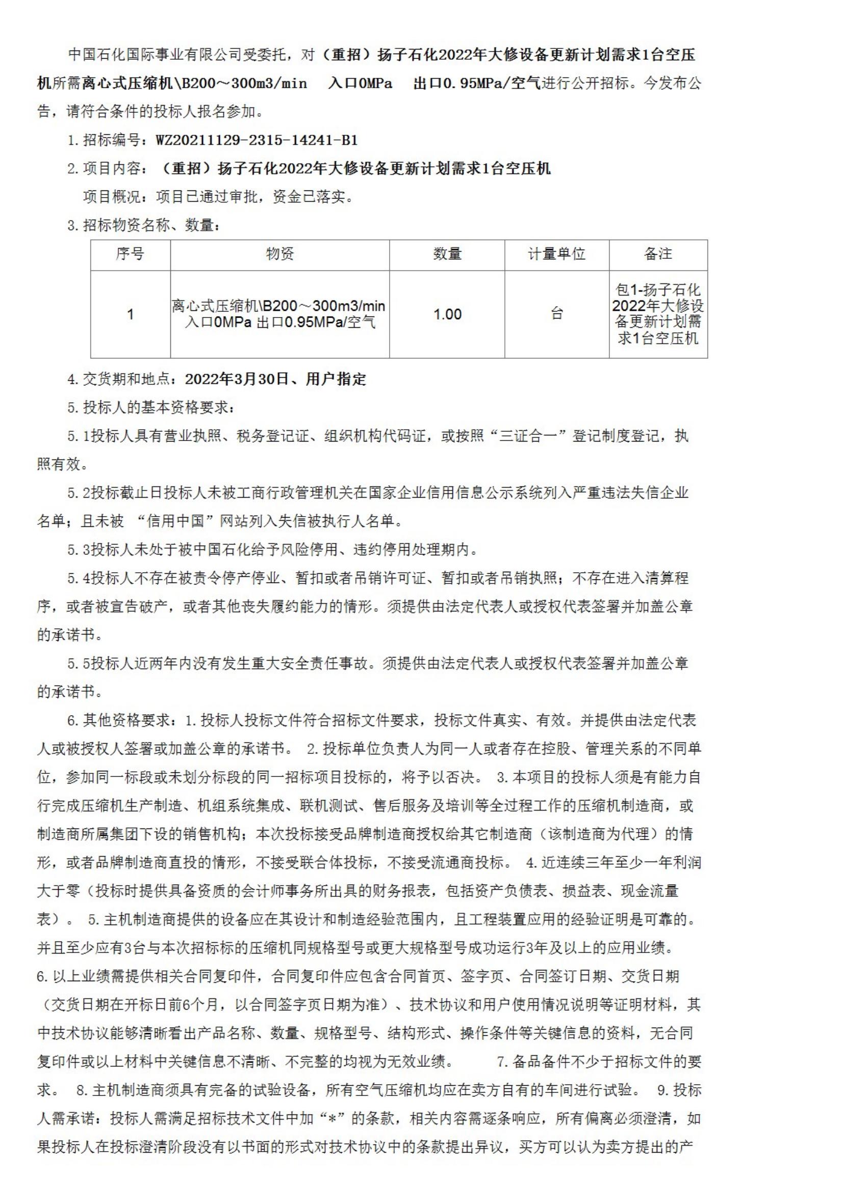 中國石化物資裝備部(國際事業(yè)公司)揚子石化2022年大修設(shè)備更新計劃離心式壓縮機B200~300m3/min 入口0MPa 出口0.95MPa/空氣招標公告