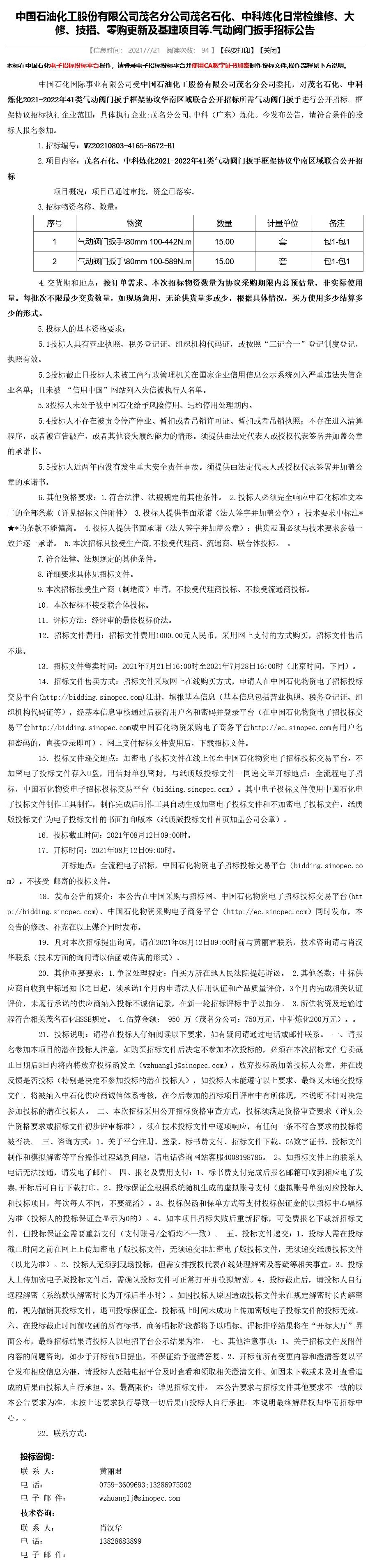 中國(guó)石化茂名石化、中科煉化日常檢維修、大修、技措、零購(gòu)更新及基建項(xiàng)目等氣動(dòng)閥門扳手招標(biāo)公告