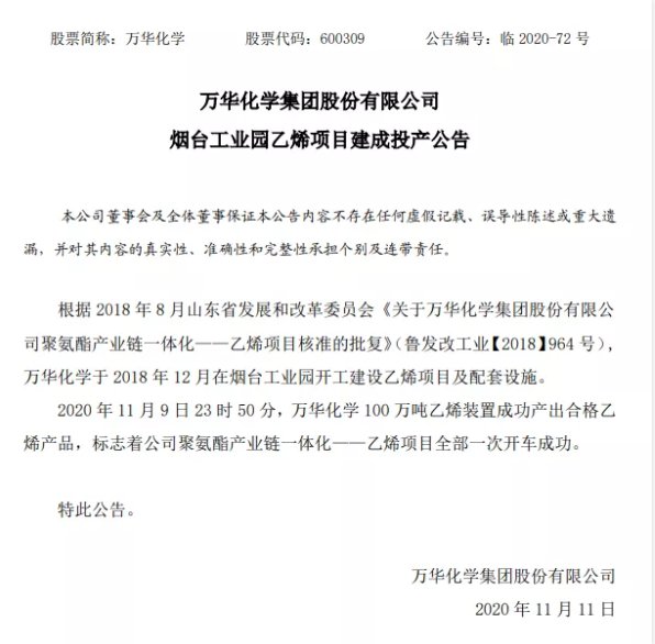 11月10日,萬華化學發布公告表示:11月9日23點54分,100萬噸/年乙烯裝置一次開車成功,生產出99.99%合格乙烯產品,至此,萬華化學聚氨酯產業鏈一體化——乙烯項目全部一次開車成功。