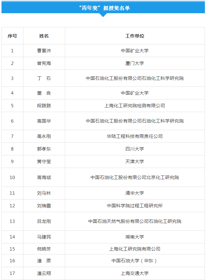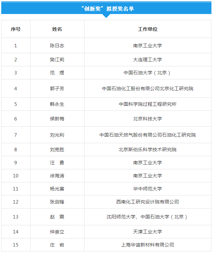 根據(jù)《侯德榜化工科學(xué)技術(shù)獎(jiǎng)獎(jiǎng)勵(lì)辦法》的規(guī)定,中國(guó)化工學(xué)會(huì)于2021年1月啟動(dòng)了2021年度侯德榜化工科學(xué)技術(shù)獎(jiǎng)的組織工作。經(jīng)有關(guān)單位提名、形式審查、專家初審和會(huì)議最終評(píng)審等程序,評(píng)選出邢衛(wèi)紅等49人擬授予侯德榜化工科學(xué)技術(shù)獎(jiǎng),其中成就獎(jiǎng)5人,創(chuàng)新獎(jiǎng)15人,青年獎(jiǎng)29人。現(xiàn)將擬授予人選予以公示。