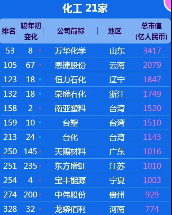化工行業有21家進入500強,市值破千億元的有:萬華化學總市值為3417億元;恩捷股份為2079億元;恒力股份為1847億元;榮盛石化為1749億元;南亞塑料為1520億元;臺塑為1510億元;臺化為1143億元;天賜材料為1016億元;東方盛虹為1010億元;寶豐能源為1003億元。