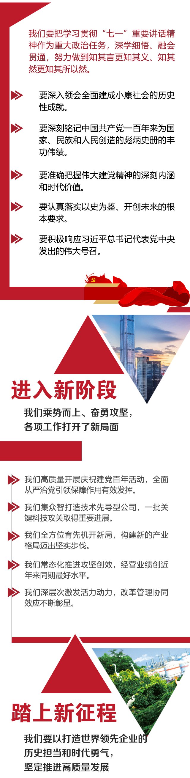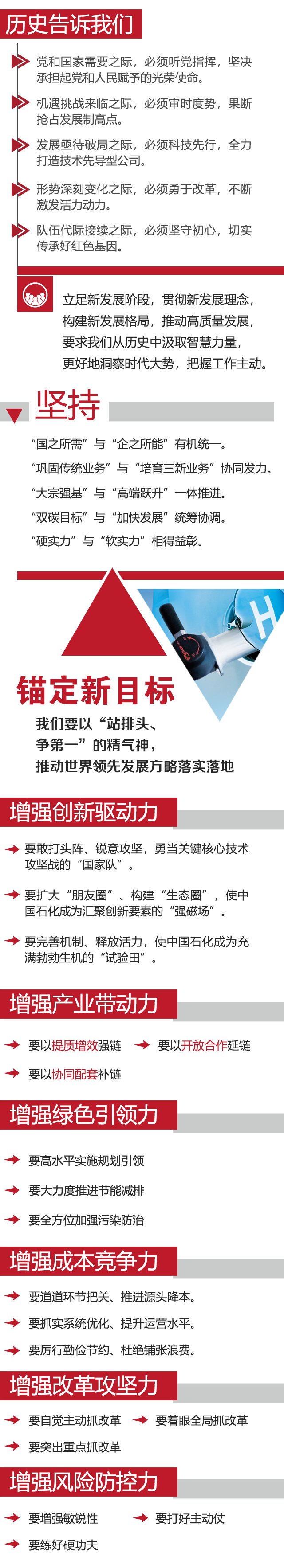 張玉卓說,踏上新征程,我們要以打造世界領先企業的歷史擔當和時代勇氣,堅定推進高質量發展。學習貫徹習近平總書記“七一”重要講話精神,就要用歷史映照現實、遠觀未來,從過往的奮斗中看清楚過去我們為什么能夠成功、弄明白未來我們怎樣才能繼續成功。要以強烈的歷史使命感責任感,從百年黨史、70余年新中國石油石化工業史、38年中國石化史中汲取智慧和經驗,戰勝前進道路上的風險挑戰,把黨的石油石化事業推向新境界。歷史告訴我們,黨和國家需要之際,必須聽黨指揮,堅決承擔起黨和人民賦予的光榮使命;機遇挑戰來臨之際,必須審時度勢,果斷搶占發展制高點;發展亟待破局之際,必須科技先行,全力打造技術先導型公司;形勢深刻變化之際,必須勇于改革,不斷激發活力動力;隊伍代際接續之際,必須堅守初心,切實傳承好紅色基因。立足新發展階段,貫徹新發展理念,構建新發展格局,推動高質量發展,要求我們從歷史中汲取智慧力量,更好地洞察時代大勢,把握工作主動。要堅持“國之所需”與“企之所能”有機統一;堅持“鞏固傳統業務”與“培育三新業務”協同發力;堅持“大宗強基”與“高端躍升”一體推進;堅持“雙碳目標”與“加快發展”統籌協調;堅持“硬實力”與“軟實力”相得益彰,以世界領先賦予“愛我中華、振興石化”新的時代內涵,把實干作為本分,永遠保持清醒頭腦,永遠保持奮斗韌勁,在新的趕考路上,矢志走到世界一流的最前面。