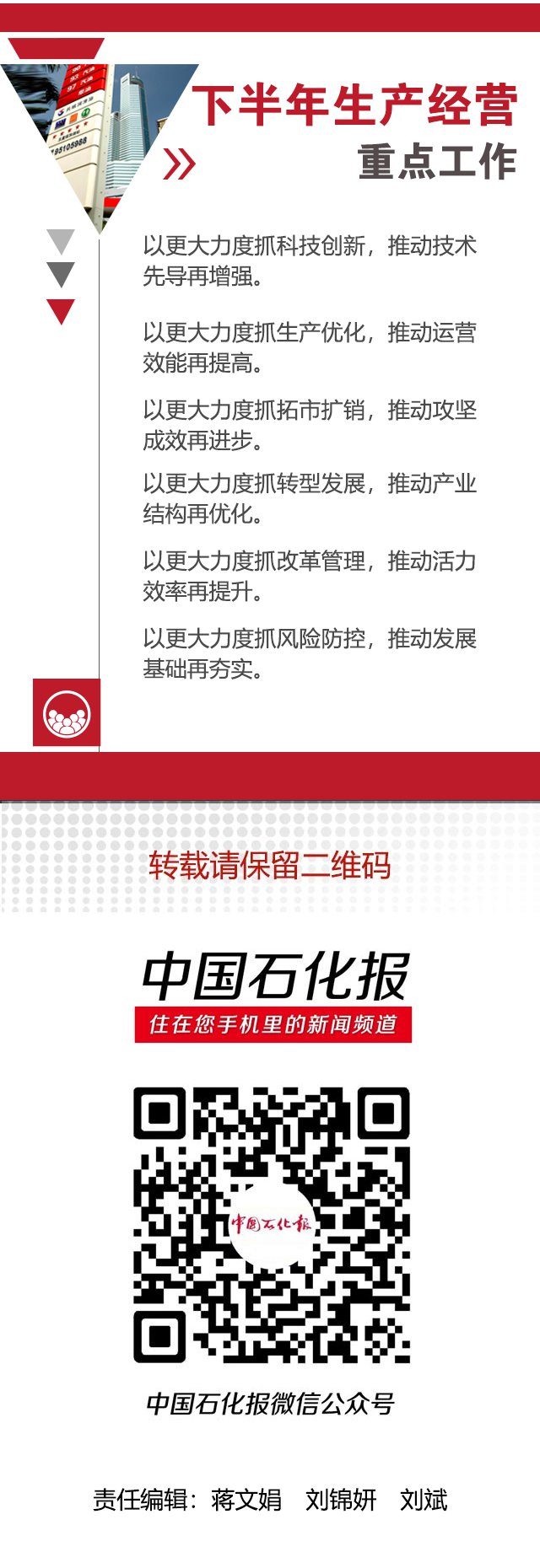 下半年重點做好以下工作:以更大力度抓科技創新,堅持“四個面向”,發揮國家戰略科技力量作用,落實高水平科技自立自強要求,深入推進體制機制改革,聚力攻堅關鍵核心技術,加快推進“兩化”深度融合,牢牢把握創新主動權、發展主動權,推動技術先導再增強。以更大力度抓生產優化,上游業務要全力抓好油氣增儲上產,煉油業務要全力抓好產品結構調整,化工業務要全力抓好裝置高效運轉,推動運營效能再提高。以更大力度抓拓市擴銷,成品油銷售要全力趕超量效進度,天然氣銷售要全力推進穩量增效,化工銷售要全力開拓市場,工程技術服務要全力拓展優質市場,煉油銷售要努力提升市場主導權和引領力,潤滑油要力爭高端潤滑油脂新領域實現新突破,催化劑要打造差異化增值服務,推動攻堅成效再進步。以更大力度抓轉型發展,牢牢把握“十四五”發展機遇,聚焦構建“一基兩翼三新”產業格局,抓好戰略規劃落實,抓好重點項目建設,抓好“三新”業務拓展,推動產業結構再優化。以更大力度抓改革管理,全力推動改革向深層次邁進,全力推進企業管理水平提升,推動活力效率再提升。以更大力度抓風險防控,充分估計困難挑戰,切實增強風險意識,堅定不移向本質安全邁進,堅持走綠色低碳發展道路,堅決防范化解經營風險,推動發展基礎再夯實。