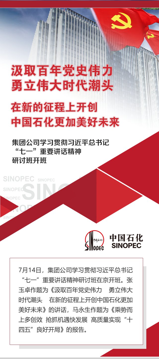 7月14日,中國石化集團公司學習貫徹習近平總書記“七一”重要講話精神研討班在京開班。集團公司黨組書記、董事長張玉卓出席并講話,強調要認真學習貫徹習近平總書記在慶祝中國共產黨成立100周年大會上的重要講話精神,落實中央企業負責人研討班部署,從百年黨史中砥礪初心使命、汲取奮進力量,加快發展育先機,勇立潮頭開新局,奮力打造世界領先潔凈能源化工公司,向著第二個百年奮斗目標奮勇前進,走好新的趕考之路。