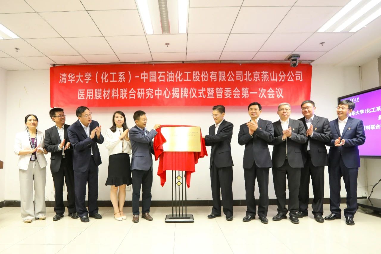 在現場人員的共同見證下,李剛、王鐵峰為清華大學(化工系)——燕山石化醫用膜材料聯合研究中心揭牌,并合影留念。