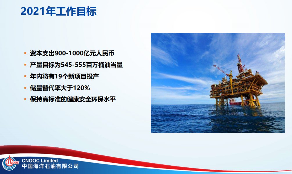 在勘探與生產業務方面,公司將加強風險勘探,突出重點區域集中勘探。2021年集團公司計劃原油產量為923.5百萬桶,可銷售天然氣產量為4,354.0十億立方英尺,油氣當量合計為1,649.4百萬桶。