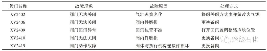 某石化公司S Zorb裝置上一生產(chǎn)周期主要程控閥故障及處理方式見表1。依照經(jīng)驗制定針對性預防性維護措施。針對設備的特性和工況制定周期性的定期維護方案,降低設備故障發(fā)生頻率。