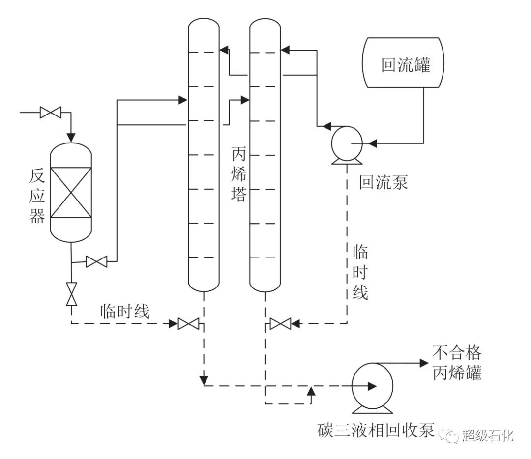分離單元停工后,受雙丙烯精餾塔內(nèi)塔盤積液下落和碳三加氫反應(yīng)器不允許排放火炬的限制,造成丙烯精餾塔塔釜滿液位和碳三加氫反應(yīng)器內(nèi)液相物料無法導(dǎo)液的困難。臨時(shí)增加了回收流程,將丙烯精餾塔內(nèi)、丙烯回流系統(tǒng)和碳三加氫反應(yīng)器內(nèi)的碳三液相物料回收至碳三回收泵入口,經(jīng)泵送出至丙烯不合格罐,完成全部碳三液相物料的回收。增加臨時(shí)物料回收流程見圖5。丙烯機(jī)作為最后停工的部分保持低負(fù)荷至無負(fù)荷運(yùn)轉(zhuǎn),在無負(fù)荷運(yùn)轉(zhuǎn)情況下,通過調(diào)整收集各段間罐液相丙烯至丙烯機(jī)一段罐,通過丙烯回收泵送至丙烯儲罐。
