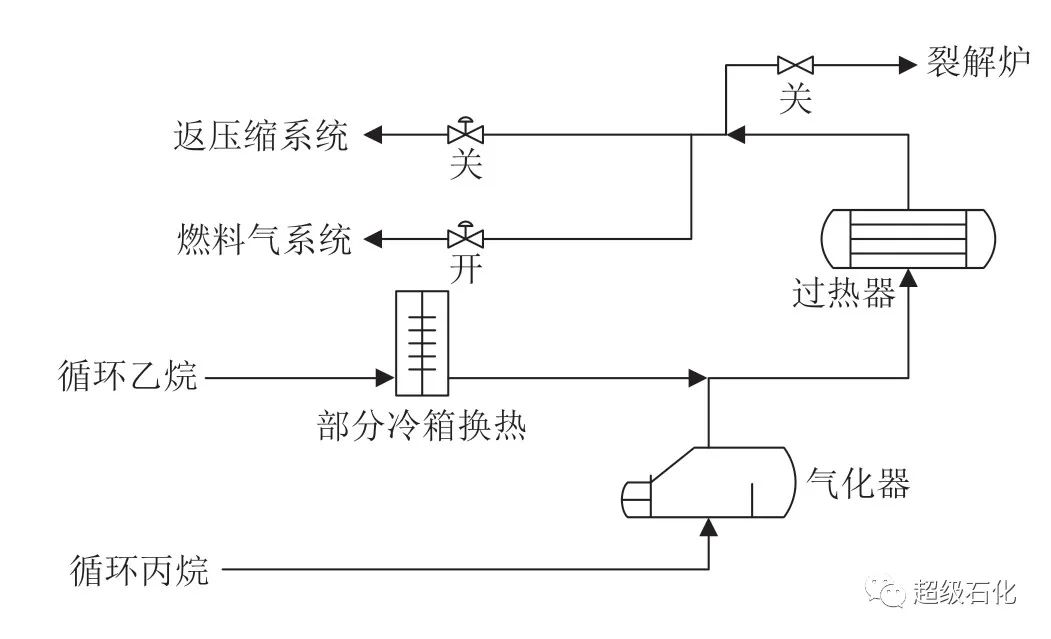 重新設(shè)計(jì)回收流程,利用乙烯機(jī)和乙烯塔熱泵流程,改循環(huán)乙烷至裂解爐流程為循環(huán)乙烷至燃料氣,首先回收乙烯機(jī)和乙烯塔內(nèi)物料,當(dāng)回收壓力低于冷分離單元壓力后,打開乙烯塔進(jìn)料閥門,建立冷分離單元→脫乙烷塔→乙烯機(jī)→燃料氣流程。