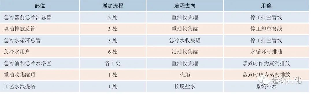 增加急冷油、盤油用戶和管線低點(diǎn)、盲點(diǎn)停工倒空臨時(shí)流程,為系統(tǒng)倒空置換作好準(zhǔn)備。增加急冷油和急冷水塔化學(xué)清洗臨時(shí)流程,為急冷單元停工交出檢修提供條件。增加重油收集罐蒸汽排放臨時(shí)流程,為急冷油塔蒸煮做準(zhǔn)備。增加急冷水用戶和管線高點(diǎn)排油臨時(shí)流程,為完成急冷水系統(tǒng)倒空做準(zhǔn)備。同時(shí)增加工藝水汽提塔補(bǔ)充脫鹽水流程,為工藝水系統(tǒng)單獨(dú)循環(huán)做準(zhǔn)備。急冷系統(tǒng)增加的臨時(shí)流程見表1。