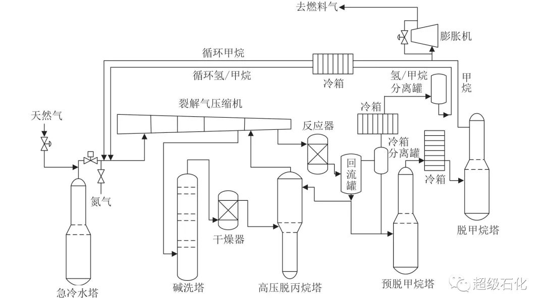 裂解氣大閥切出系統(tǒng)后,投用急冷水塔真空保護(hù)流程補(bǔ)入天然氣,裂解氣壓縮機(jī)進(jìn)行天然氣置換,利用天然氣的露點(diǎn)低于裂解氣露點(diǎn)的特性,使系統(tǒng)內(nèi)裂解氣快速冷凝[1],同時(shí)各段間罐降液位操作,至裂解氣壓縮機(jī)各段間罐無液位運(yùn)轉(zhuǎn)。為保證天然氣進(jìn)入深冷單元的品質(zhì),堿洗塔繼續(xù)循環(huán)操作。高壓脫丙烷塔及回流罐無液位后切斷壓縮單元與熱分離系統(tǒng)聯(lián)系。建立壓縮單元和冷分離單元天富余部分進(jìn)入燃料氣系統(tǒng),保持整個(gè)循環(huán)進(jìn)行。