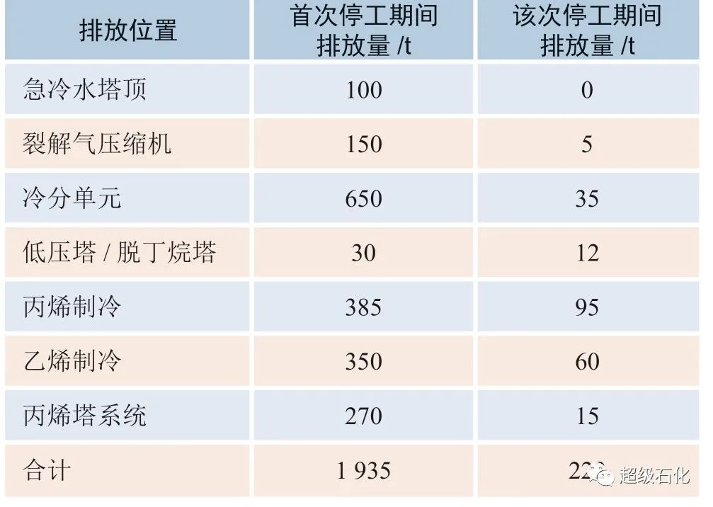 與首次停工檢修相比,烴類物質(zhì)的回收量顯著提高,該次烴類排放量222 t,比首次停工降低1 713 t,在準(zhǔn)備停工退出第一臺裂解爐后的48 h內(nèi),首次停工火炬排放平均值為41 t/h,而該次停工僅為5.6 t/h,平均減排35.4 t/h。