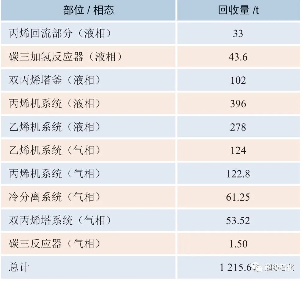 裝置停工后,碳二、碳三系統(tǒng)及兩臺制冷機(jī)組物料回收共計(jì)1 215.67 t,回收情況見表2。