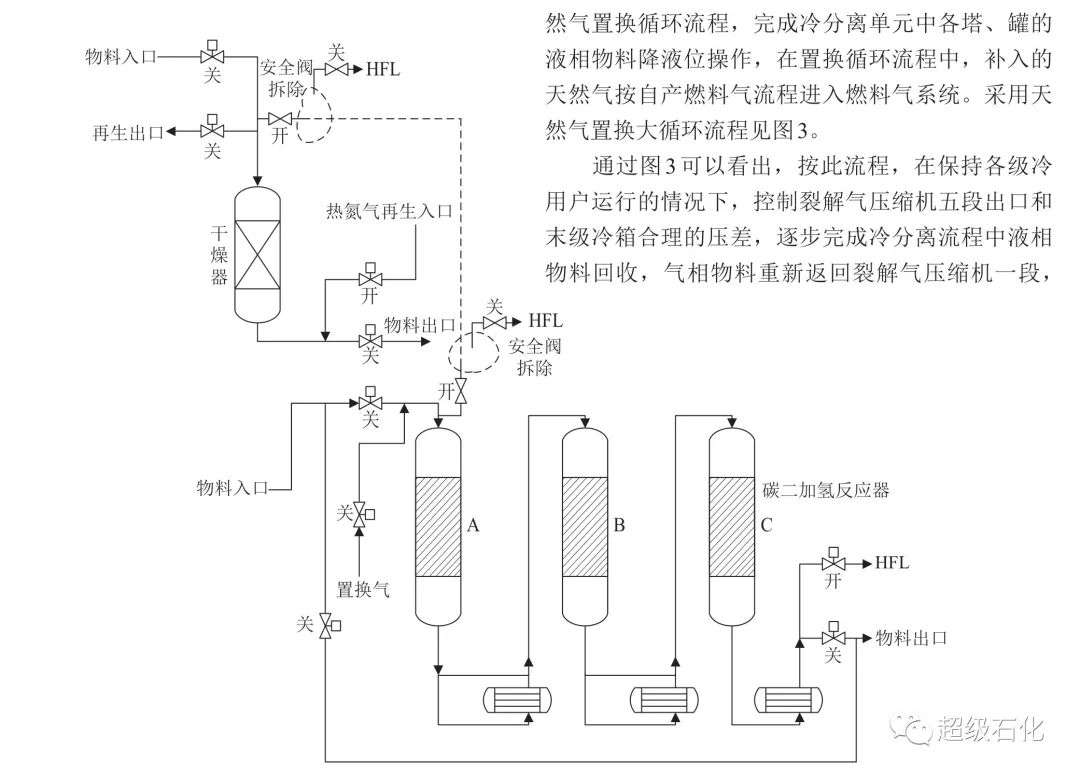 降低燃料氣系統(tǒng)壓力,裂解爐保持4 +1 燒焦或熱備,充分回收后系統(tǒng)氣相物料進(jìn)入燃料氣系統(tǒng)。經(jīng)過化學(xué)清洗和蒸煮的急冷單元排空殘留的凝液和水,進(jìn)入氮?dú)獯祾摺⒅脫Q階段。壓縮單元進(jìn)行系統(tǒng)氮?dú)庵脫Q及干燥器、反應(yīng)器的氮?dú)庠偕ぷ鳌7蛛x制冷單元進(jìn)行氣相回收和液相碳三物料回收。