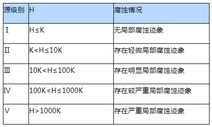 按照JB/T 10764-2007標準的規定,采用聲發射源的區域定位分析及下表所示分級方法進行儲罐底板數據分析。表中H為單個通道每小時出現的撞擊數,K值通過相同的檢測儀器與工作參數對相同規格和運行條件的儲罐進行一定數量的檢測試驗和開罐驗證試驗取得。