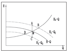 泵運行工況點是由泵特性曲線H-Q和裝置特性曲線HZ-Q共同決定的。兩條的交點M即是泵的運行工況點,如圖1所示。