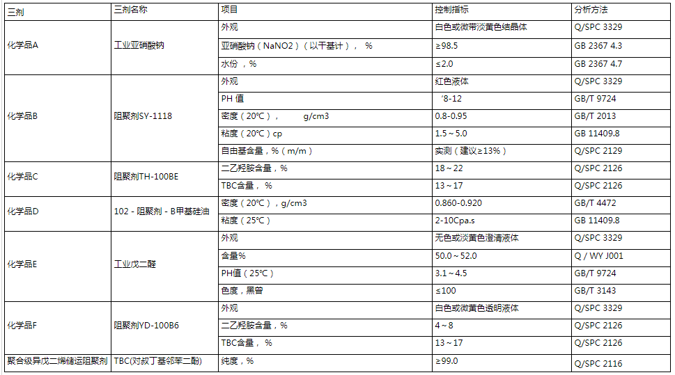 在燕山石化碳五分離裝置運行過程中,亞硝酸鈉作為重要的除氧劑和阻聚劑,一直未達到要求含量;化學品B和化學品D因注入點在溶劑泵入口處,受吸入壓力影響較大;化學品C和化學品F屬于低溫度阻聚劑,因此注入點在精餾塔氣相出口,隨回流進入精餾塔液相,在氣液交換過程中,濃度逐漸降低,返回再沸器稀釋料量級偏小,這些因素導致再沸器阻聚效果變差,聚合嚴重。