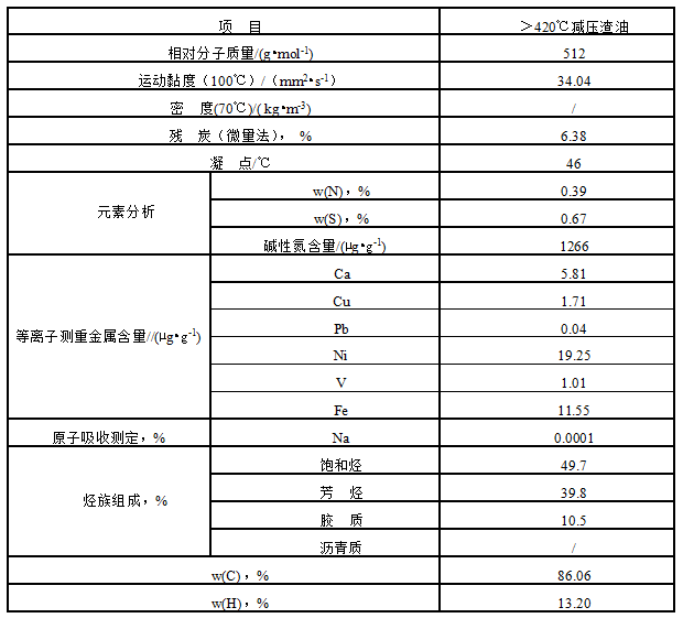 原料殘炭較高,烴族組成中飽和烴含量較低、芳烴含量較高。說明該原料具有較高的生焦趨勢;催化汽油高辛烷值易保證;原料較難裂化,反應應采用較高的苛刻度。