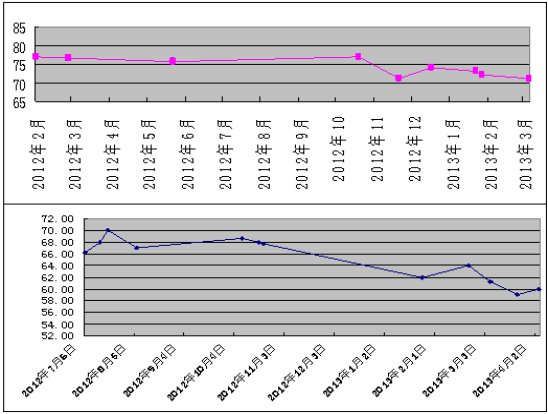 從圖9可以看出,2012年期間催化裝置平衡劑活性基本在68~70。平衡劑活性偏高后,裂化反應加劇,反應過程中氣體產量增加,塔底重組分偏少,分餾塔底液位難以控制,油漿外甩量偏低,制約著反應溫度和劑油比的提高。