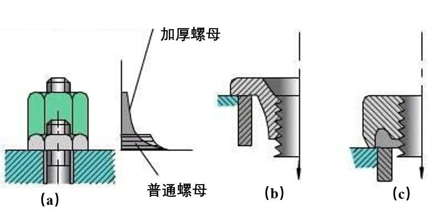 所以,采用圈數(shù)多的厚螺母,并不能提高聯(lián)接強度。若采用圖1(b) 的懸置(受拉)螺母,則螺母錐形懸置段與螺栓桿均為拉伸變形,有助于減少螺母與栓桿的螺矩變化差,從而使載荷分布比較均勻。圖 1(c)為環(huán)槽螺母,其作用和懸置螺母相似。