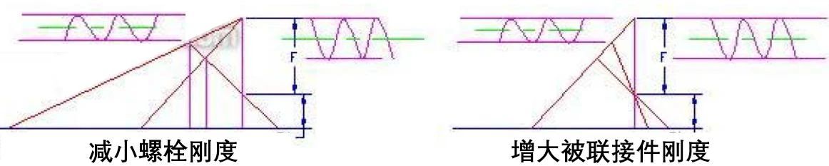 螺栓的最大應(yīng)力一定時,應(yīng)力幅越小,疲勞強度越高。在工作載荷和剩余預(yù)緊力不變的情況下,減小螺栓剛度或增大被聯(lián)接件的剛度都能達到減小應(yīng)力幅的目的(見圖 5),但預(yù)緊力則應(yīng)增大。