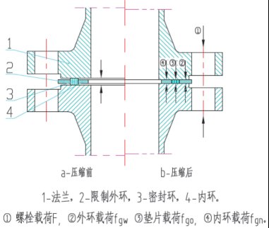 如圖1-b所示,密封件設置限制環,在密封連接部件安裝的時候,保證法蘭金屬表面直接接觸(指凹凸面法蘭或隼槽法蘭)或和密封件限制環金屬表面接觸,并保證在密封服役期內,始終保持金屬面的接觸,螺栓載荷通過法蘭面分別作用于密封面和金屬限制環上,從而保證了密封工作應力在密封服役期間的恒定。