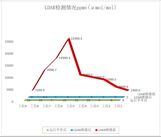 恒應力墊片已成功應用于石油化工各高溫、高壓、溫度壓力交變工況等苛刻環境下,解決了密封宏觀泄漏問題,并實現了對VOCs排放的有效控制,以某石化采用恒應力密封墊片LDAR修復前和修復后對比為例,從最高2萬多 ppmv(μmol/mol)在第一次修復后所有部位降到了10ppmv以下,單點最高減排率為99.974%,運行半年后泄漏最高值不超過20ppmv。