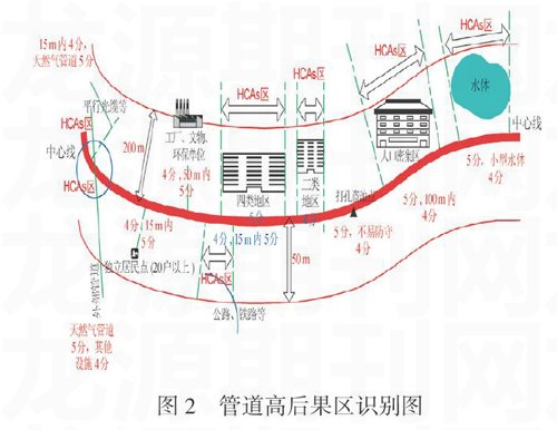 高后果區(qū)是指如果管道發(fā)生泄漏或斷裂等事故,會(huì)對(duì)公眾安全、財(cái)產(chǎn)、環(huán)境、社會(huì)等造巨大損失的區(qū)域,隨著人口和環(huán)境資源的變化,高后果區(qū)的地理位置和范圍也會(huì)隨著改變。經(jīng)過(guò)管線(xiàn)與周邊環(huán)境的相對(duì)位置、管線(xiàn)易產(chǎn)生打孔盜油點(diǎn)情況進(jìn)行分析,研究形成了《管道高后果區(qū)評(píng)價(jià)準(zhǔn)則和評(píng)分細(xì)則》,其可視化展示如圖2所示。